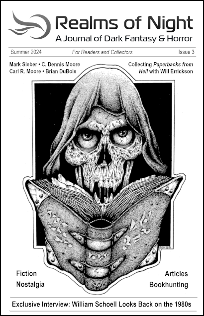 This issue features an interview with pulp horror master William Schoell, an article on collecting Paperbacks from Hell by Will Errickson, vintage horror reviews in Mark Sieber’s Dead Trees column, non-fiction from C. Dennis Moore and Brian DuBois, plus new fiction by Carl R. Moore, and once again, all manner of insane compositions by yours truly, including new installments of The Bookhunter and The Halls of Horror. Finally, we return with a classic Allen K. cover and interior art that makes for a strikingly handsome package. There’s plenty to please the casual reader and collector!